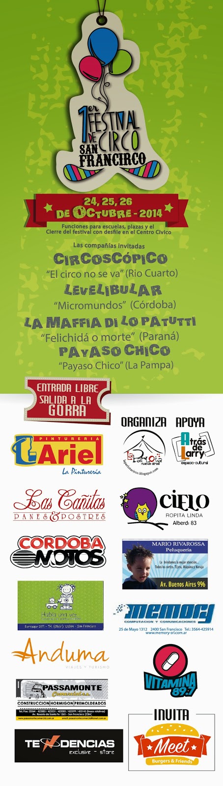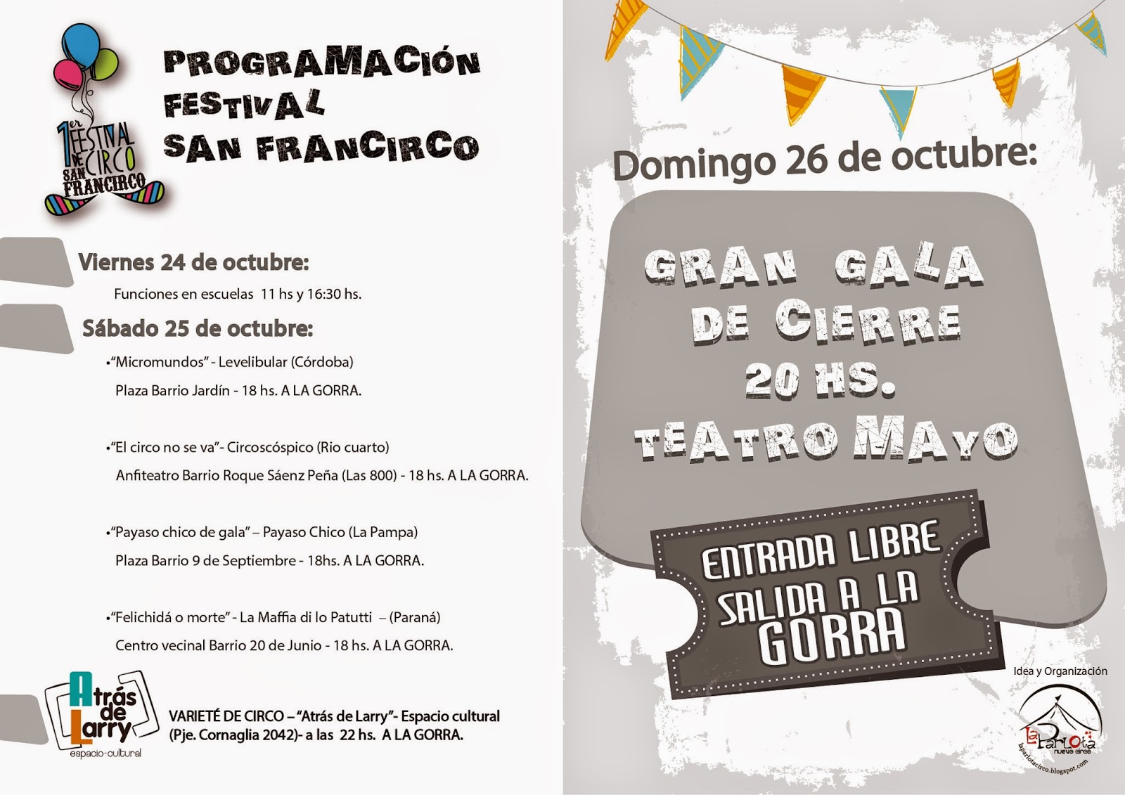 Hace 12 años los primeros malabaristas se paraban en los semáforos de San Francisco a mostrar su arte e intervenir artísticamente el espacio público. Hace 10 años, en el año 2004 , se formaba la primera compañía de circo (pequeña, pero pujante). HOY el circo en San Francisco festeja una década de trabajo ininterrumpido luego de giras, encuentros , festivales nacionales e internacionales, donde la ciudad se ha visto excelentemente representada por sus artistas. El 24, 25 y 26 de octubre La Parlota Circo organiza el 1er Festival de Circo "San FranCirco 2014".